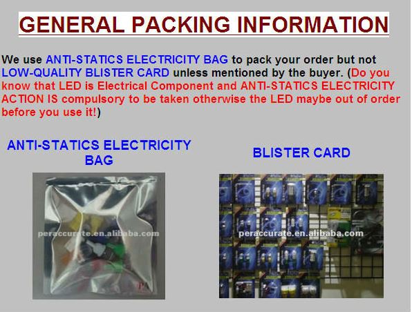 ● نستخدمهامكافحة الكهرباء STATICS حقيبةلحزم طلبك ولكن ليسمنخفض النوعية بطاقة BLISTER ما لم يذكرها مشتر. (هل تعلم أن LED هو مكون كهربائي وأعمال مضادة للكهرباء STATICS هو إلزامي الواجب اتخاذها غير ذلك ربما الصمام خارج الترتيب قبل استخدامه!)